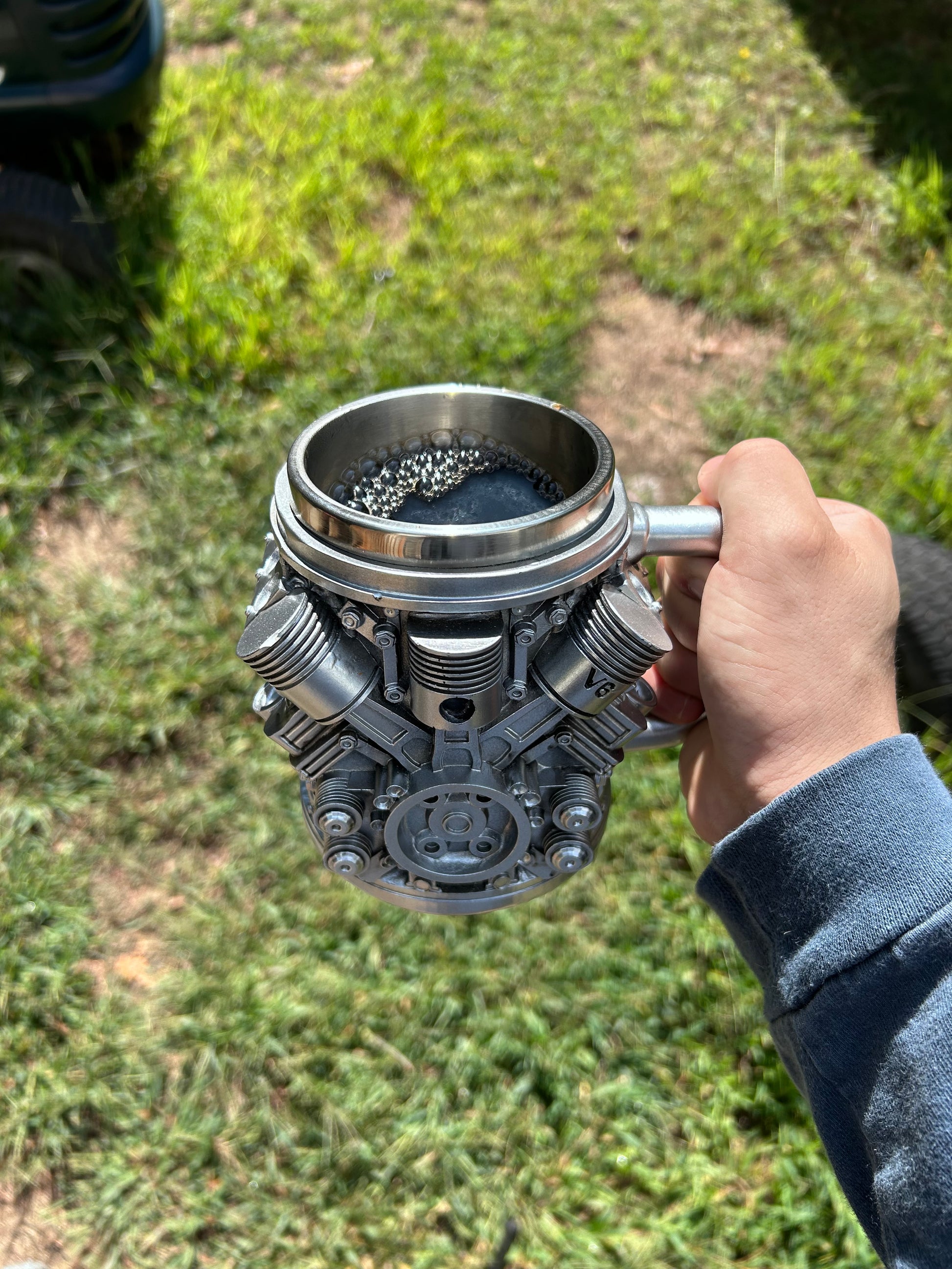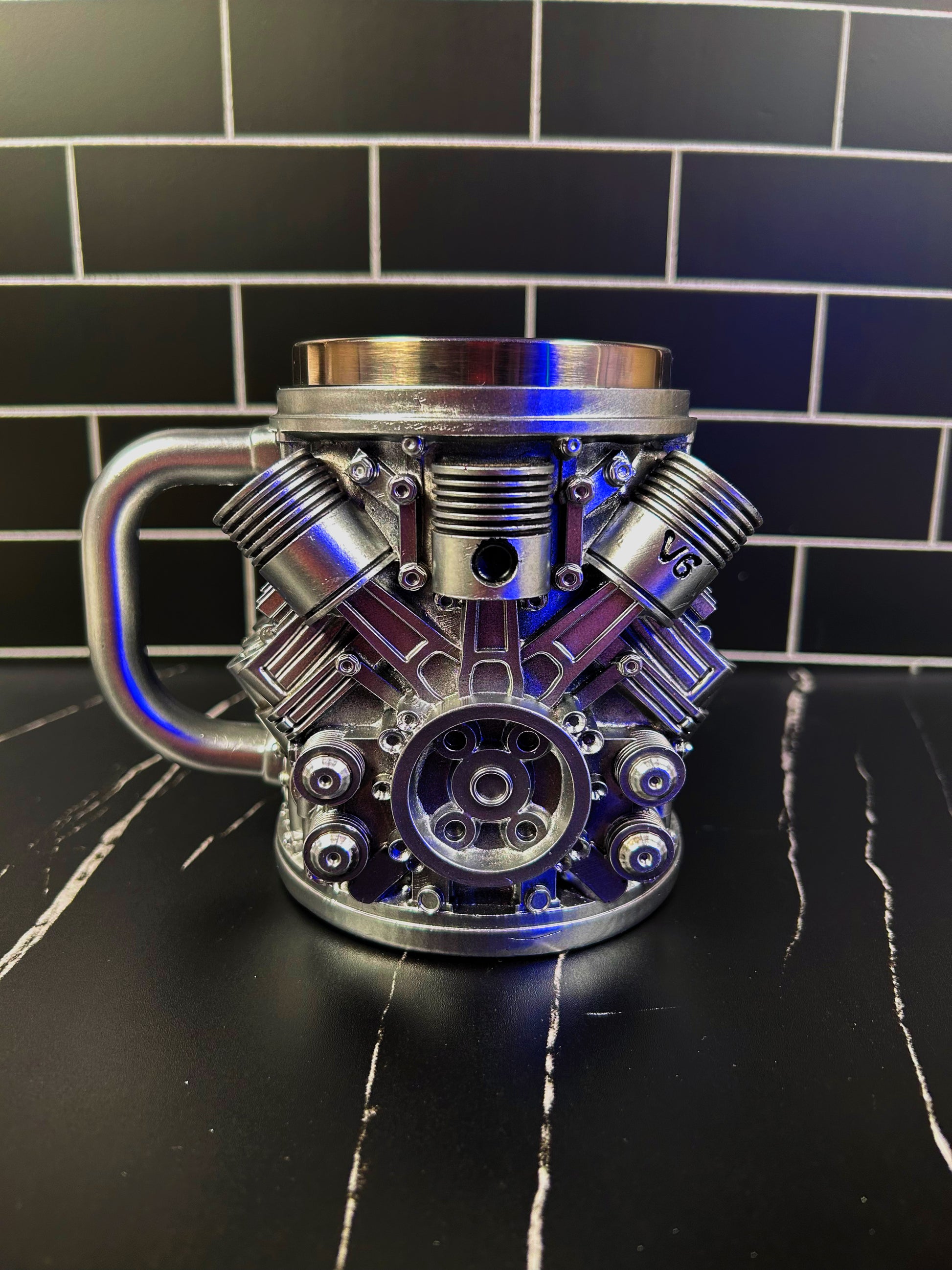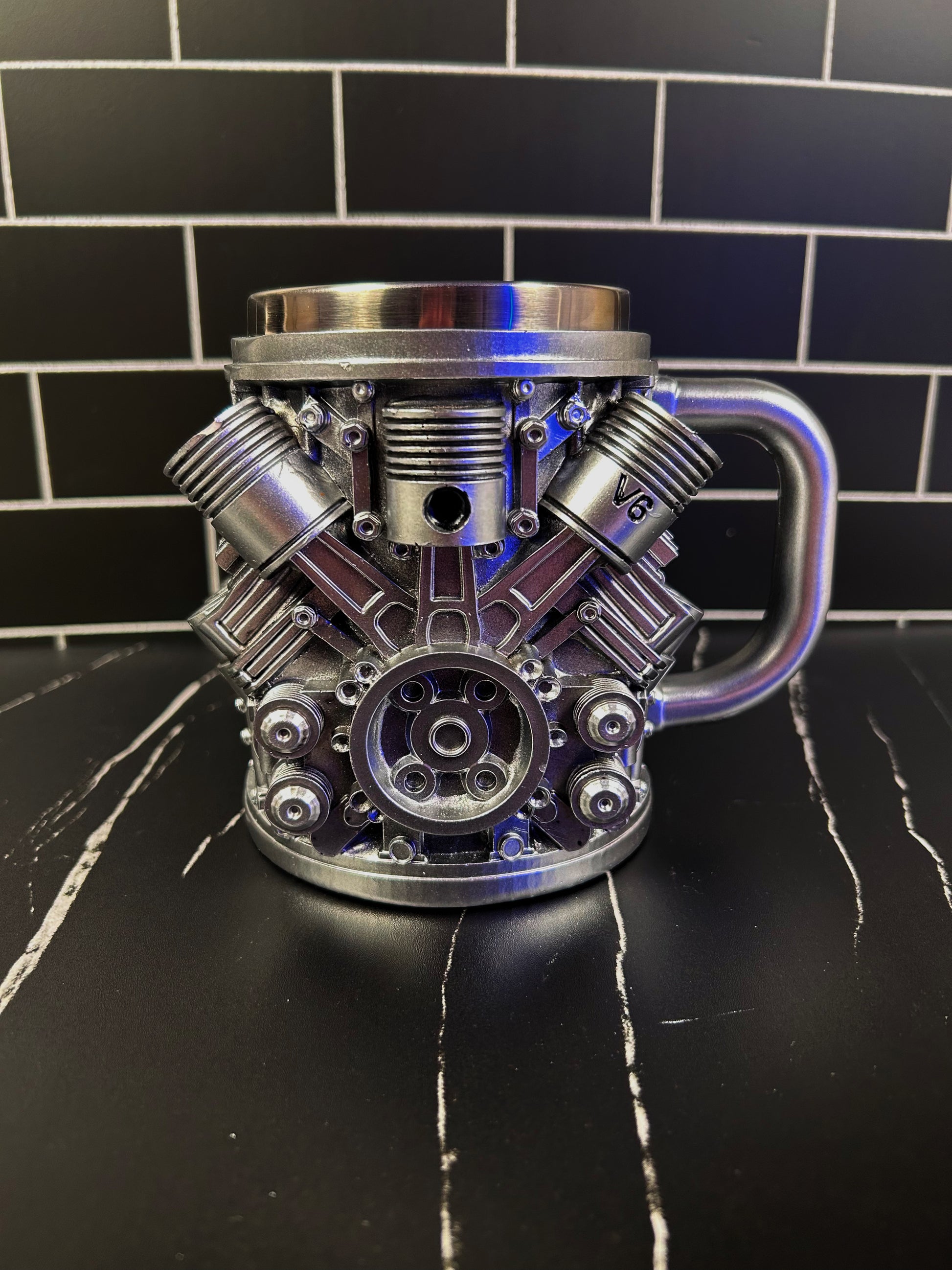 Rev up your mornings with this 15 oz V6 mug a bold blend of stainless steel interior and a detailed resin exterior, built for car enthusiasts. Engineered for durability, this mug weighs about 1–1.5 lbs, giving it a solid, premium feel. Measuring roughly 4.5–5 inches tall and 3.5–4 inches wide, it’s the perfect size for coffee, tea, or any drink that fuels your day.